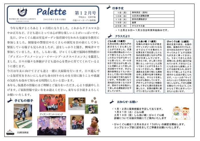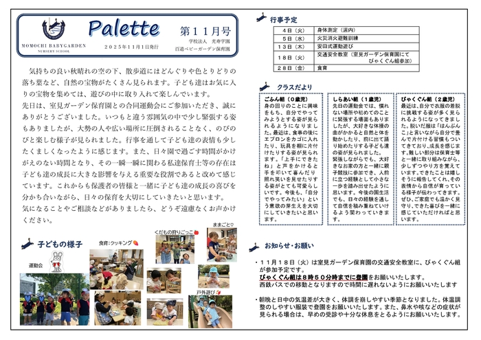 百道ベビーガーデン保育園トップページ > 百道ベビーガーデン保育園 お知らせと新着情報Instagramはこちらから2025-07-31園だよりをアップしました。2020-03-28ホームページをリニューアルいたしました。RSS(別ウィンドウで開きます)百道ベビーガーデン保育園 重要事項説明書(2025-04-01 ・ 196KB) 園だより(百道’25)第4月号(百道’25)第5月号(百道’25)第6月号(百道’25)第7月号(百道’25)第8月号(百道’25)第9月号(百道’25)第10月号(百道’25)第11月号(百道’25)第12月号給食献立表園の概要 保育方針や概要、交通アクセスなどご案内します。 くわしくはこちらくわしくはこちらくわしくはこちら園の一日 朝の登園から夕方の降園までの一日をクラス毎にご紹介します。 くわしくはこちらくわしくはこちらくわしくはこちら年間行事 当園の年間行事をご案内いたします。 くわしくはこちらくわしくはこちらくわしくはこちらフォトアルバム 当園の写真です。 くわしくはこちらくわしくはこちらくわしくはこちら