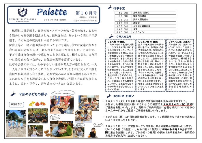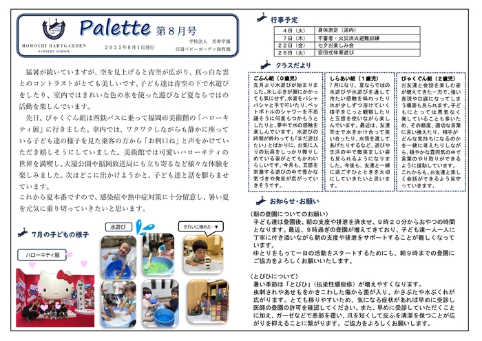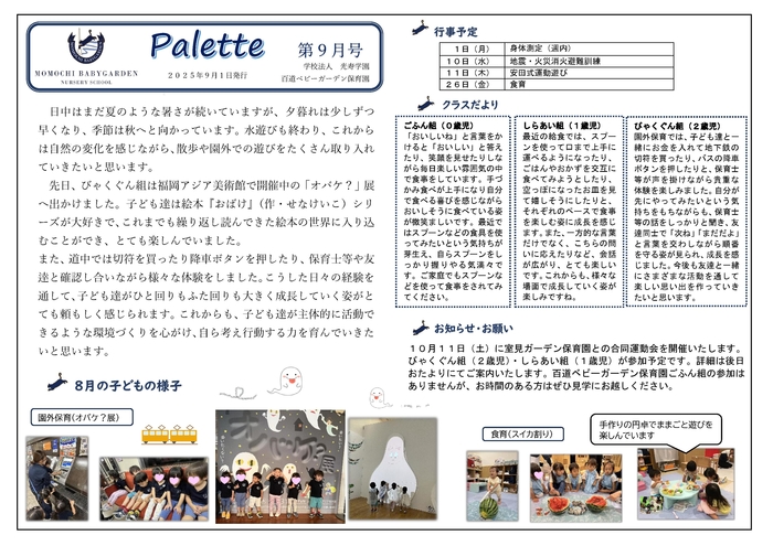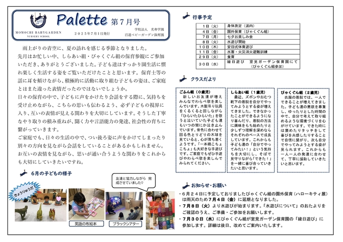 百道ベビーガーデン保育園トップページ > 百道ベビーガーデン保育園 お知らせと新着情報 ▼年月選択 2025年07月 2024年01月 2020年03月 検索Instagramはこちらから2025-07-31園だよりをアップしました。2020-03-28ホームページをリニューアルいたしました。RSS(別ウィンドウで開きます)(1~3/3件)百道ベビーガーデン保育園 重要事項説明書(2025-04-01 ・ 196KB) 園だより(百道’25)第4月号(百道’25)第5月号(百道’25)第6月号(百道’25)第7月号(百道’25)第8月号(百道’25)第9月号(百道’25)第10月号給食献立表園の概要 保育方針や概要、交通アクセスなどご案内します。 くわしくはこちらくわしくはこちらくわしくはこちら園の一日 朝の登園から夕方の降園までの一日をクラス毎にご紹介します。 くわしくはこちらくわしくはこちらくわしくはこちら年間行事 当園の年間行事をご案内いたします。 くわしくはこちらくわしくはこちらくわしくはこちらフォトアルバム 当園の写真です。 くわしくはこちらくわしくはこちらくわしくはこちら